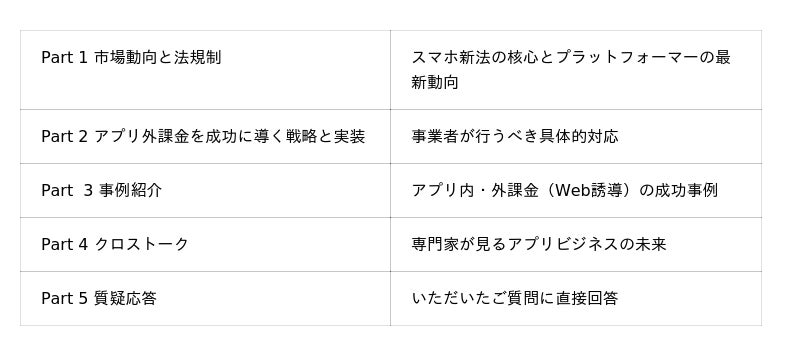 今回のセミナーでは、GMO-PGとRepro双方の知見を活かし、アプリ内課金とアプリ外課金それぞれの特性や留意点を整理しながら、アプリ事業者が押さえるべき最新動向や実務ポイントを事例も交えてわかりやすく解説します。スマホ新法の全面施行に伴うアプリ外課金の制度的な変化にとどまらず、手数料最適化・導線設計・セキュリティ対策など、ビジネス判断に必要となるトピックを総合的にお伝えします。