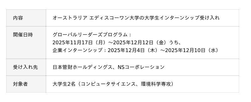 日本管財ホールディングス株式会社(本社:東京都中央区、代表取締役社長:福田 慎太郎、以下「当社」)は、日本管財グループで、オーストラリアの大学生2名を対象にインターンシップを受け入れたことをお知らせいたします。