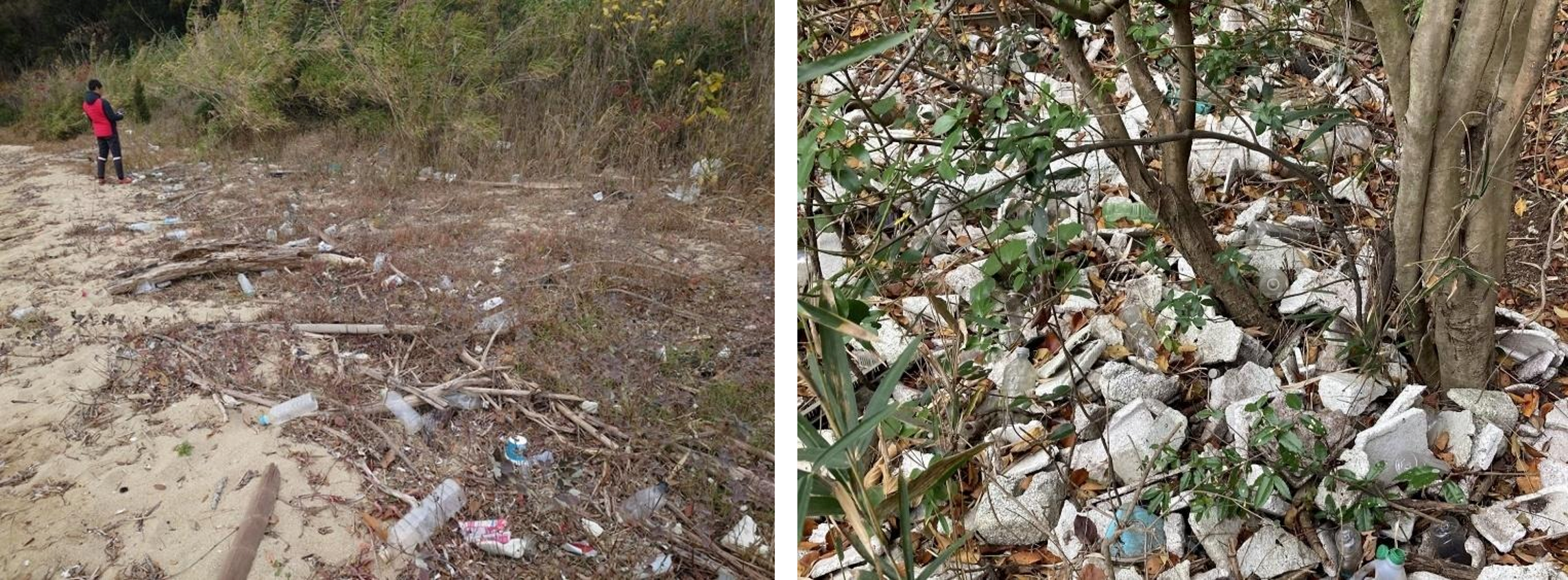 清掃活動場所となったのは瀬戸大橋の架かる櫃石島。2020年の国勢調査によると人口151人で漁業が中心の島です。対象の海岸は島の西側と北側の2カ所で、西側は長い間清掃活動が実施されていなかったのか劣化したプラスチックごみが目立ち、北側は冬の西風で集まった比較的新しい漂着ごみが多数見受けられました。両海岸とも茂みの中にはバラバラになったプラスチックごみが堆積しており、時間の許す限り根こそぎクリーンアップすることを目標に設定しました。