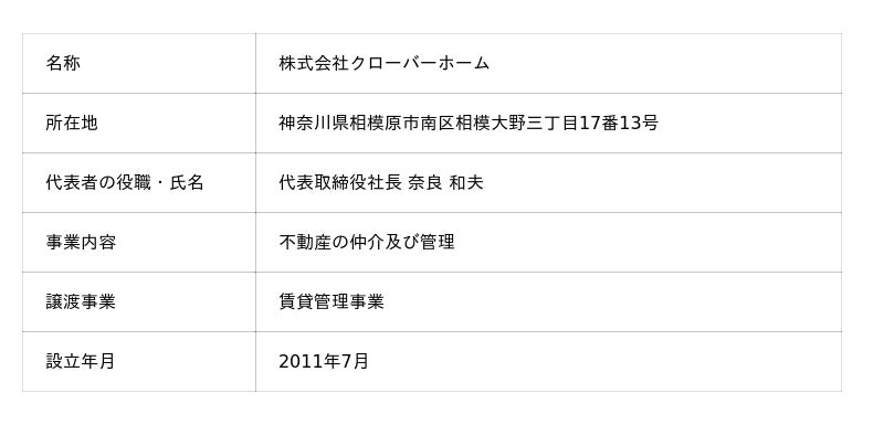 クローバーホームは、神奈川県相模原市を主要拠点として賃貸管理業を展開しております 。同エリアにて、同様に賃貸管理業を営む当社グループ会社Footworkとは、事業的な親和性が極めて高いことから、この度の事業譲受に至りました。本件を通じ、当社グループは収益基盤のさらなる安定化を図るとともに、持続的な成長を目指してまいります。