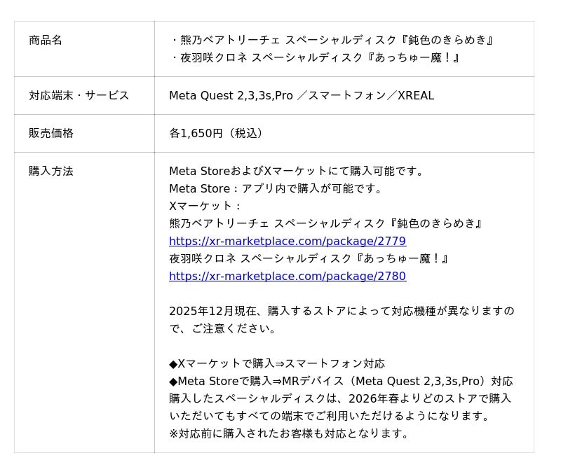 本作は2名によるライブパフォーマンスを立体的な3D空間映像として再構築しており、ステージの熱量・視線・表情を最前列にいるかのような”没入感でお楽しみいただけます。スマートフォン、Meta Quest 3 ほか対応デバイスにて、自宅にいながらライブ会場さながらの体験が可能です。