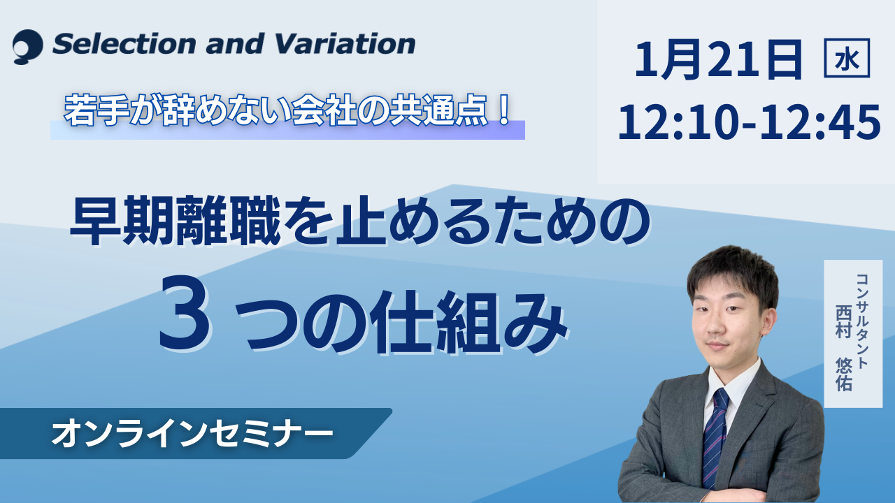 https://sele-vari.co.jp/ )は『若手が辞めない会社の共通点!早期離職を止めるための3つの仕組み』セミナーを2026年1月21日(水)12:10~12:45に開催することをお知らせいたします。