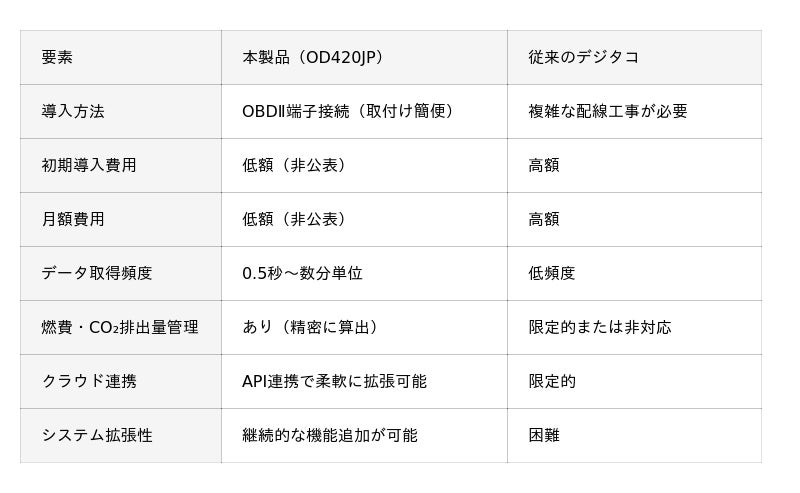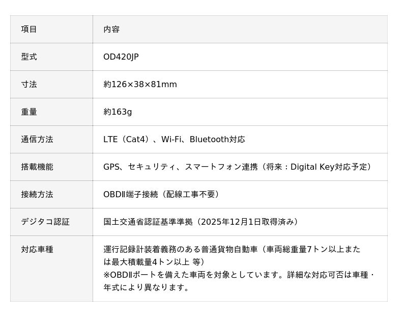 OD420JPはAPI連携を前提に設計されており、顧客が既存の業務システムや運用フローを活かしながら段階的にDXを推進できる柔軟性を備えています。これにより、将来的なデジタコ義務化を見据えた装着率向上を後押しするとともに、業界全体のデジタル化を加速させます。
