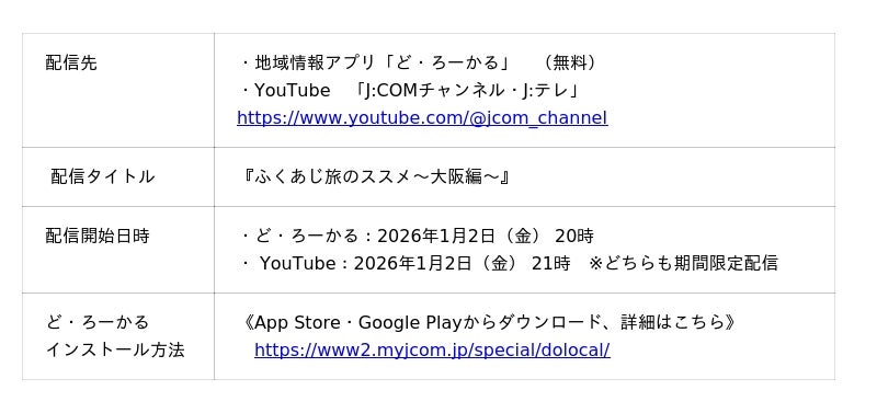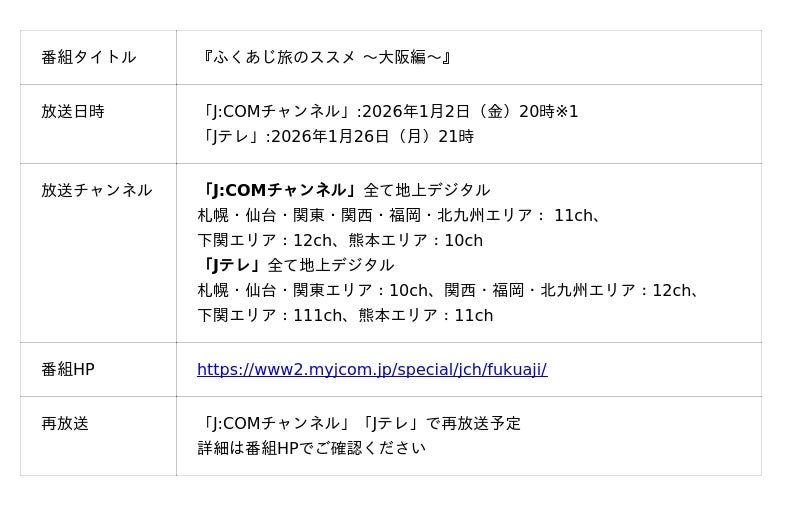 JCOM株式会社(J:COM、本社:東京都千代田区、代表取締役社長:岩木 陽一)は、「J:COMチャンネル」にて、2026年1月2日(金)20時から『ふくあじ旅のススメ~大阪編~』を放送いたします。今作では、番組監修で放送作家の小山薫堂さんの旅のパートナーとして、漫才師のハイヒール・モモコさんをお迎えし、大阪の街をめぐり、食を通じて出会う人々と触れあう「ふくあじ旅」を楽しみます。