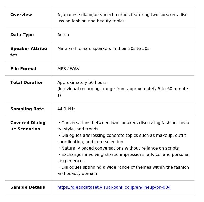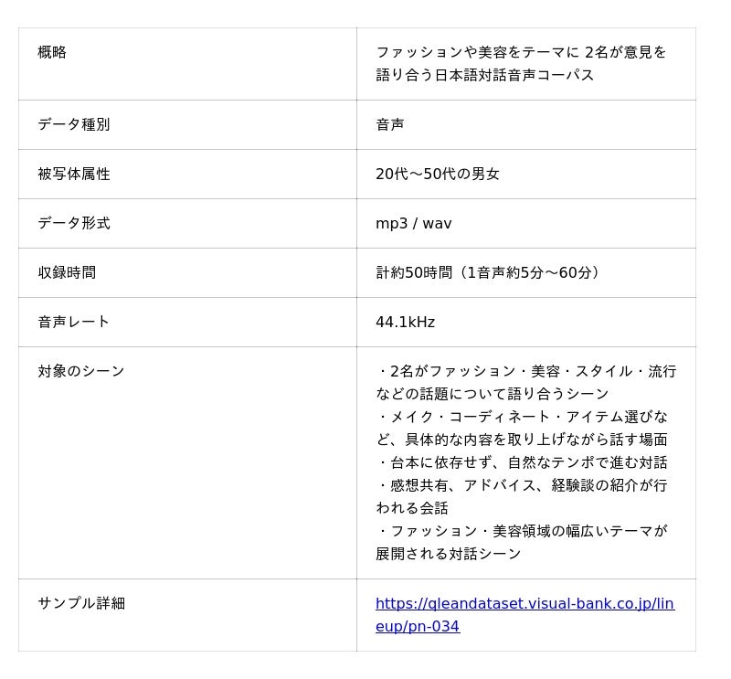 今回提供を開始する「日本語・2話者・ファッション・美容テーマトーク音声コーパスデータセット」の概要
