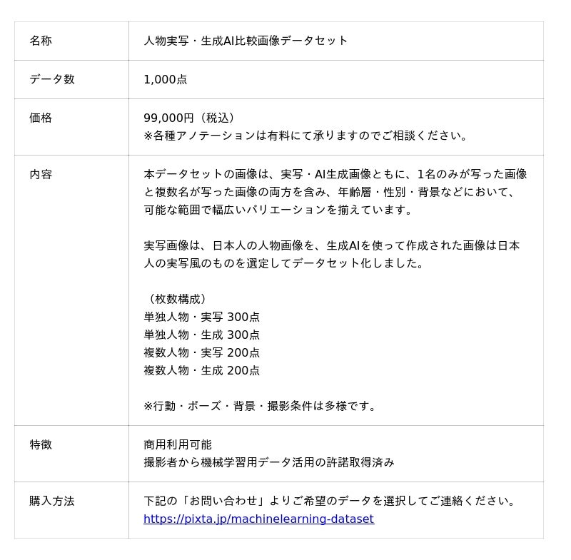 PIXTA(ピクスタ)」は、「機械学習用画像・動画データ提供サービス」として、「人物実写・生成AI比較画像データセット」を販売いたします。