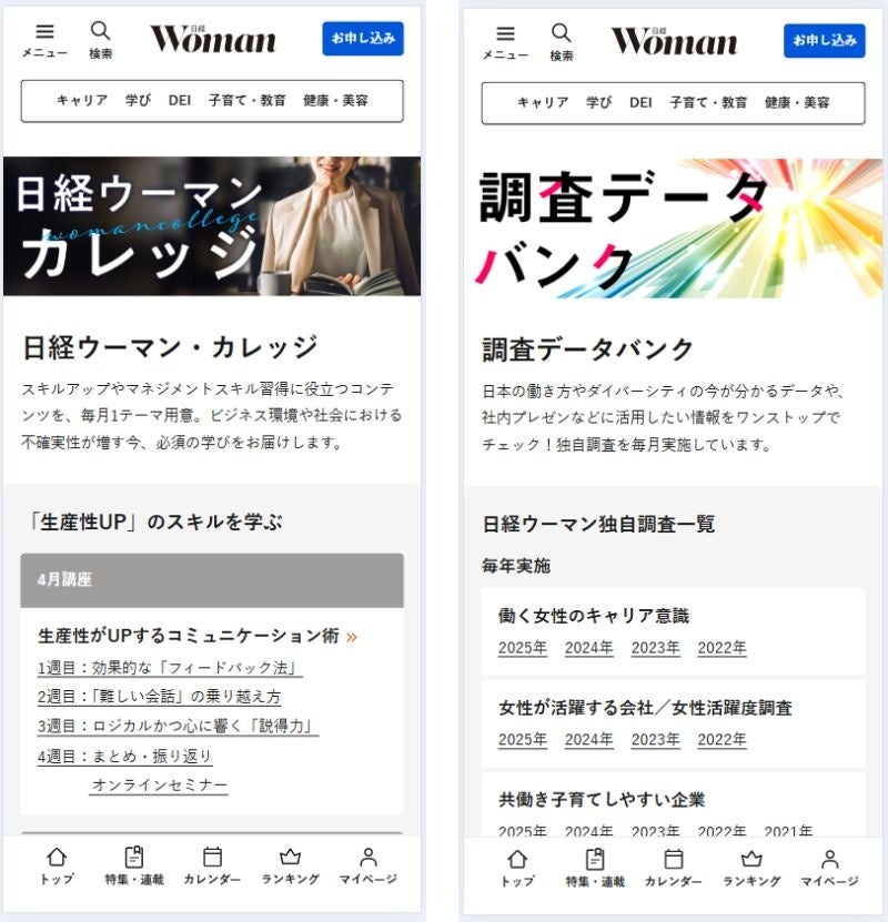 月刊誌「日経ウーマン」とのコンテンツ連携により、手帳術や時間術など働く女性の学びやスキルアップに役立つ記事のほか、旅やリベラルアーツ、パーソナルな時間を深掘りした記事など人生を豊かにするコンテンツを強化します。