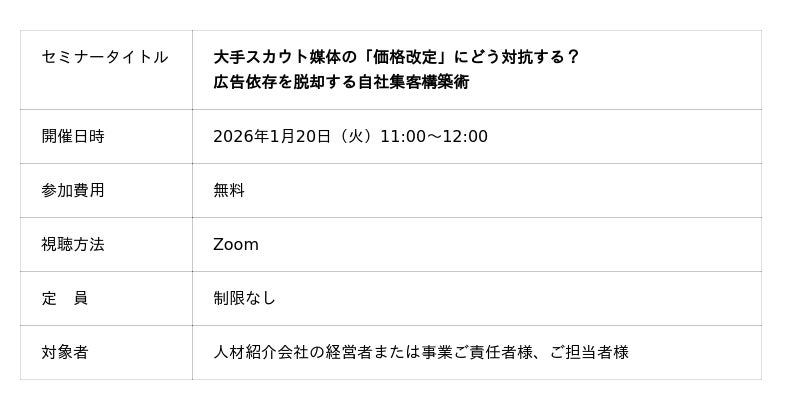 大手スカウト媒体の「価格改定」にどう対抗する? 広告依存を脱却する自社集客構築術」と題した無料セミナーを2026年1月20日(火)11:00~オンラインで開催いたします。
