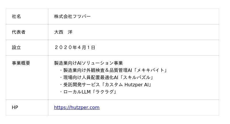フツパー社は『最新テクノロジーを確かな労働力に』をミッションに掲げ、製造業向けにAI技術を活用したソリューションを提供するスタートアップです。主力サービスである外観検査自動化AI「メキキバイト」をはじめ、AI受託開発サービス「カスタムHutzperAI」、人材配置最適化システム「スキルパズル」、さらにインターネット接続不要の生成AI「ラクラグ」など、製造現場のDXを支援する幅広いサービスを展開しています。