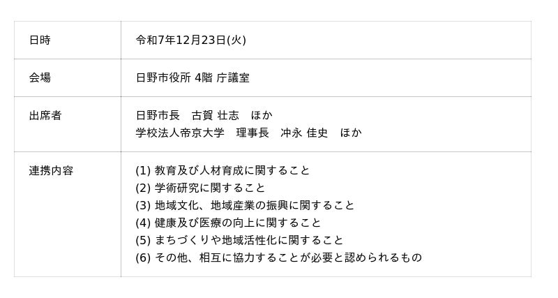 日野市では優先施策の一つに「心身ともに健康で幸福度の高いまちに」を掲げ、かねてより様々な地域の事業者や大学などとの共創による課題解決を進めてきており、健康施策をはじめとする各分野について地域との連携を進めております。日野市と学校法人帝京大学が連携することで、こうした地域の課題解決の取り組みを更に促進させること、協働のまちづくりを進めることで、地域の課題に迅速かつ適切に対応し、持続可能な個性豊かな地域社会の形成及び発展に寄与することを目的に、令和7年12月23日に「相互協力・連携に関する包括協定」を締結いたしました。