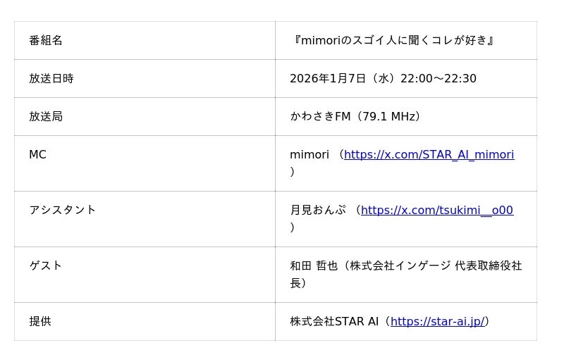 顧客対応クラウド「Re:lation(リレーション)」を提供し、6,000社以上(※1)の導入実績を誇る株式会社インゲージ(本社:大阪府大阪市、代表取締役社長:和田 哲也)は、株式会社STAR AIのデータサイエンティストmimoriさんがMCを務めるラジオ番組『mimoriのスゴイ人に聞くコレが好き』(かわさきFM 毎月第1水曜日 22時00分~22時30分)にゲスト出演いたします。