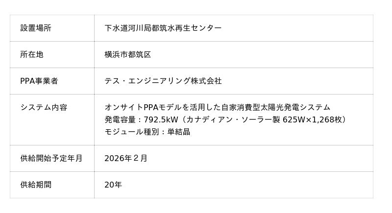 テスホールディングス株式会社(本社:大阪市淀川区、代表取締役社長:山本 一樹、以下「当社」)は、連結子会社であるテス・エンジニアリング株式会社(本社:大阪市淀川区、代表取締役社長:高崎 敏宏、以下「テス・エンジニアリング」)が、神奈川県横浜市(市長:山中 竹春、以下「横浜市」)の下水道河川局都筑水再生センター(以下「都筑水再生センター」)向けに、オンサイトPPAモデル※1を活用した自家消費型太陽光発電システムによる再生可能エネルギー電気の供給(以下「本事業」)を行うことが決定いたしましたので、お知らせいたします。本事業による再生可能エネルギー電気の供給は、2026年2月から開始予定です。