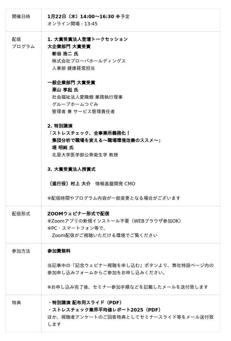 弊社・株式会社情報基盤開発(本社:東京都文京区、代表取締役:鎌田長明、以下情報基盤開発)は2026年1月22日(木)、「ストレスチェック大賞2025 記念ウェビナー」をオンライン配信致します。