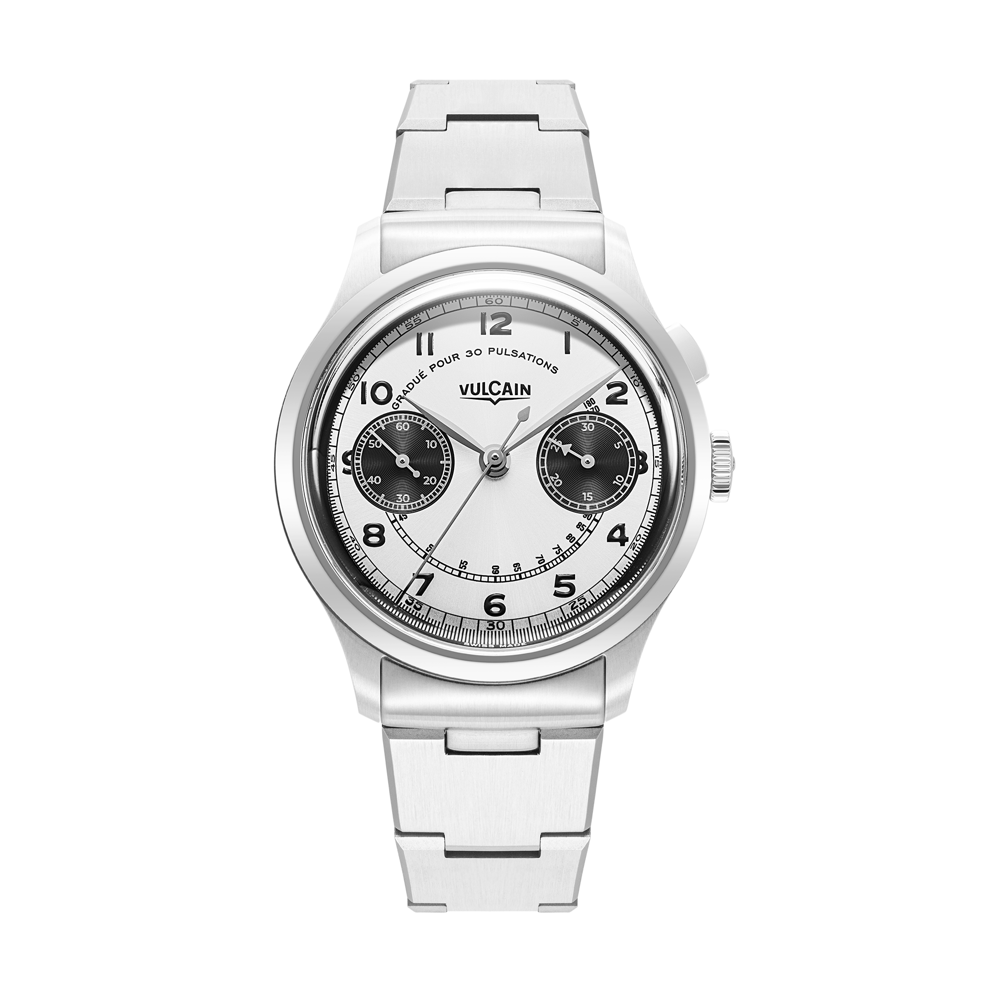 『Monopusher(モノプッシャー)』として生まれ変わった新作は、コンパクトな39mmケースを採用し。文字盤のアラビア数字やインデックスはオリジナルに忠実。12時位置のロゴ下には 『Graduated for 30 pulsations』と記されたパルソメーターを備えます。唯一のアップデートはムーブメントで、現代の精度を誇るSELLITA SW510手巻きキャリバーを搭載。ヴァルカンの歴史とレアル・マドリードの栄光が融合した、唯一無二のクロノグラフです。