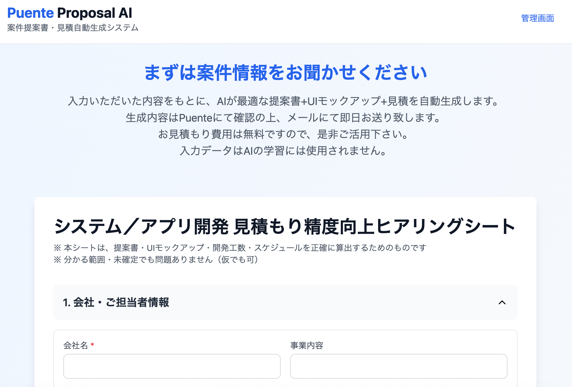 株式会社プエンテ(本社:埼玉県所沢市、代表取締役社長:保科一男)は、案件提案書・概算見積・開発スケジュール・UIモックアップ・までをAIで一括生成するB2B向けSaaS「Proposal AI(プロポーザルエーアイ」 を正式リリースしました。