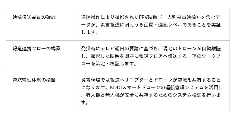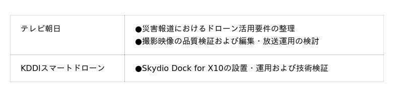 株式会社テレビ朝日(本社:東京都港区、代表取締役社長:西 新、以下「テレビ朝日」)、KDDIスマートドローン株式会社(本社:東京都千代田区、代表取締役社長:博野 雅文、以下「KDDIスマートドローン」)は、ドローンポートを活用した遠隔操作による災害報道の実現に向けた取り組みを開始します。