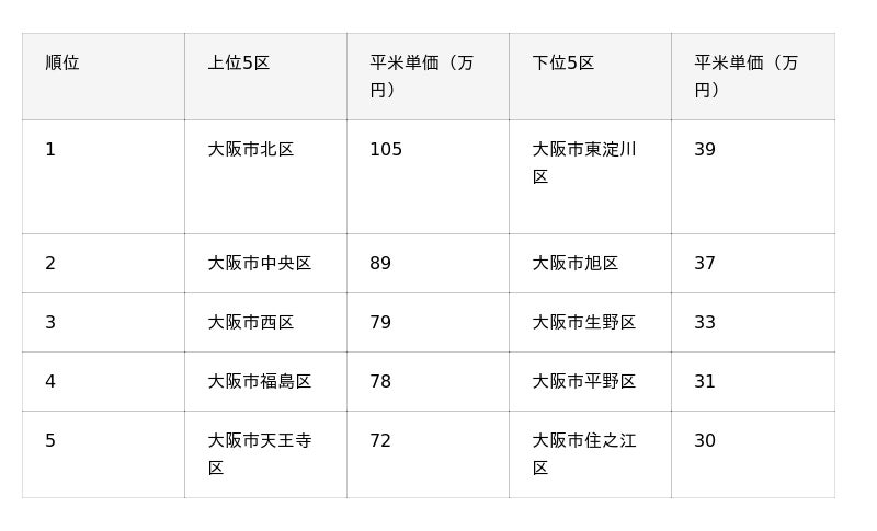 大阪市内平米単価の上位区・下位区別ランキング(2025年12月時点)