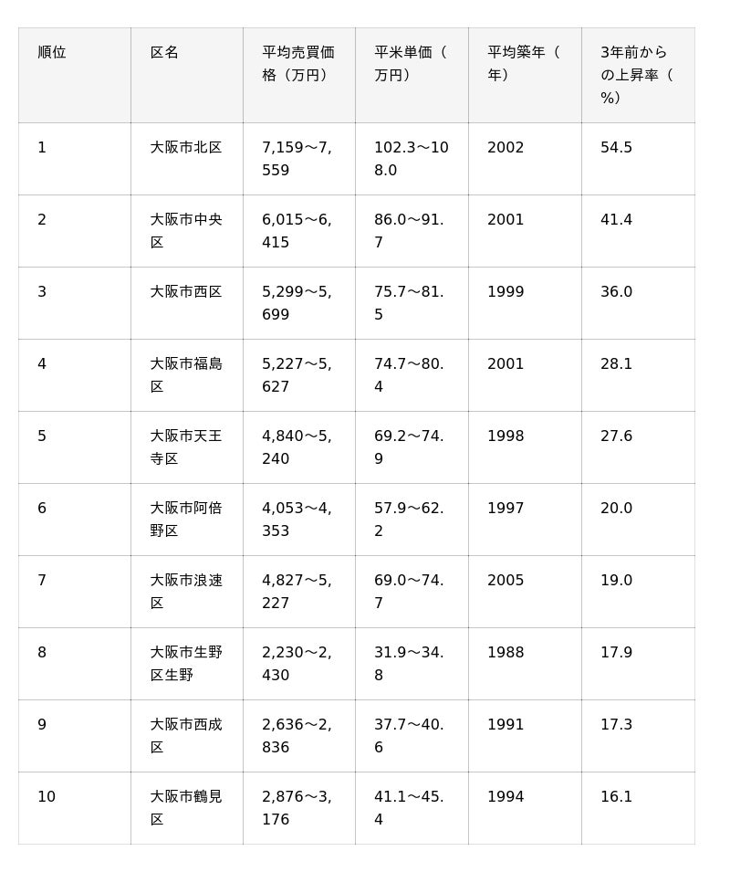 マンションナビ独自のデータより、大阪市内各区3年前からの価格上昇率が高い順にランキング化しました。
