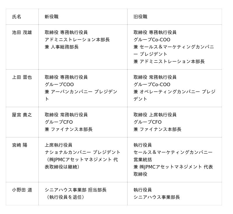 “持続可能な賃貸経営”を追求する株式会社JPMC(本社:東京都千代田区、代表取締役 社長執行役員:武藤 英明、以下「JPMC」)は、取締役及び執行役員の担当職務の変更および役付執行役員の異動について、下記のとおり決定いたしましたので、お知らせいたします。