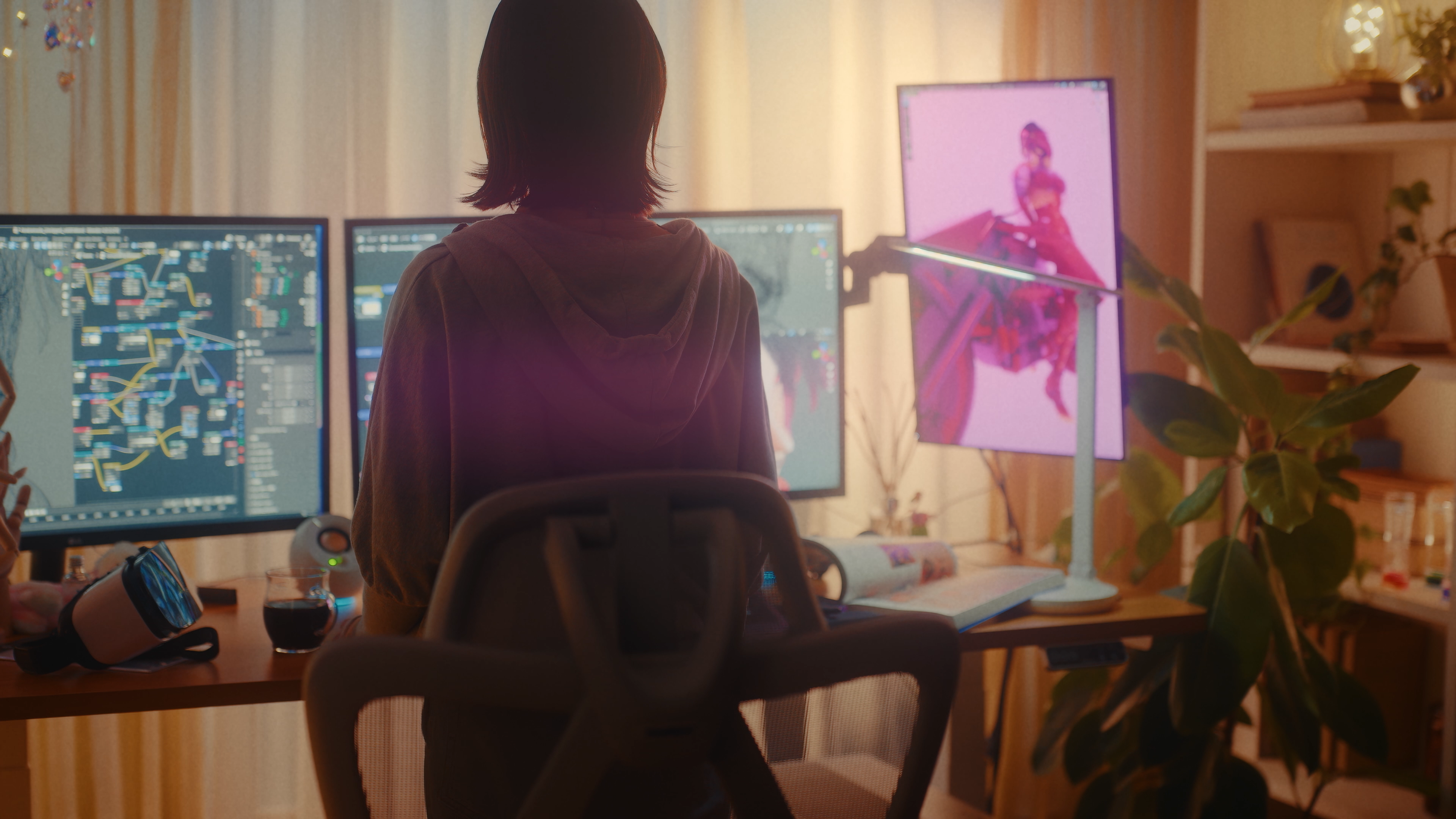 一方、別の部屋では、女性デザイナーがモニターの光に照らされながら、長時間向き合ってきた作品にまだ納得できず、深いため息を漏らしています。コーヒーはすでに飲み干され、思考も行き詰まったまま。