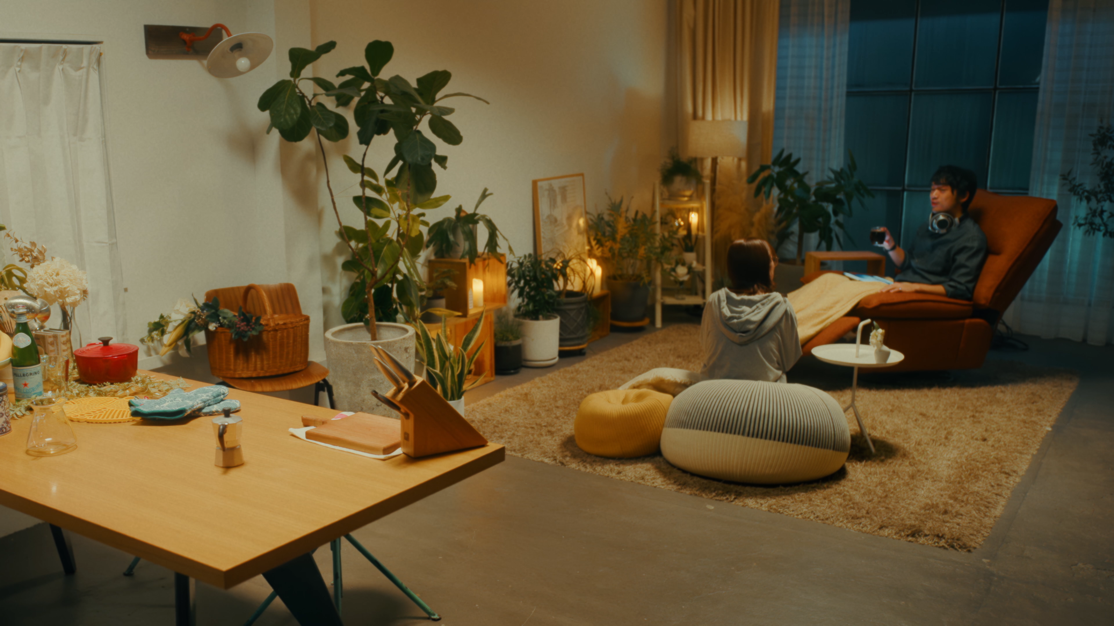 彼女は部屋を離れ、キッチンで新しいコーヒーを淹れます。その途中、柔らかな灯りに包まれたリビングで、男性がソファに身を預け、ヘッドフォン越しに自作の音楽に没入している姿が目に入ります。