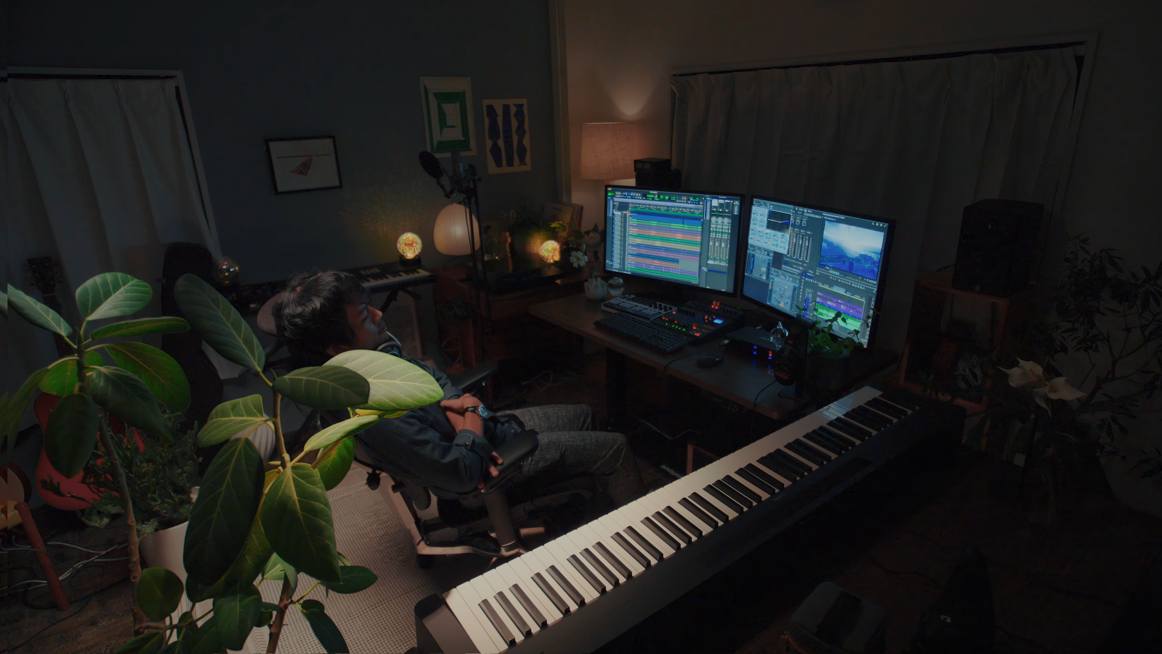 静寂に包まれ、自分だけの世界に戻るその瞬間、張り詰めていた思考が緩み、沈んでいたインスピレーションが静かに浮かび上がります。彼は目を開き、キーボードに手を伸ばし―探し続けていた旋律が、ついに生まれます。