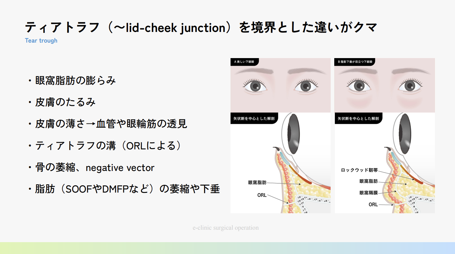 また、併せて目頭切開(Z法)も講義が開催され、蒙古襞の強さやパーツバランスに応じた切開デザイン、後戻りを防ぐための剥離の重要性等が語られました。さらに下眼瞼領域では、前回に引き続き裏ハムラ法(経結膜的眼窩脂肪移動術)が取り上げられ、クマの原因分類や、ORL剥離によるティアトラフ改善の理論、脂肪の移動・固定法などの講義が行われ。眼窩脂肪を活かした自然な改善が可能で、ダウンタイムも比較的短い点など、多くの参加者が関心を寄せました。