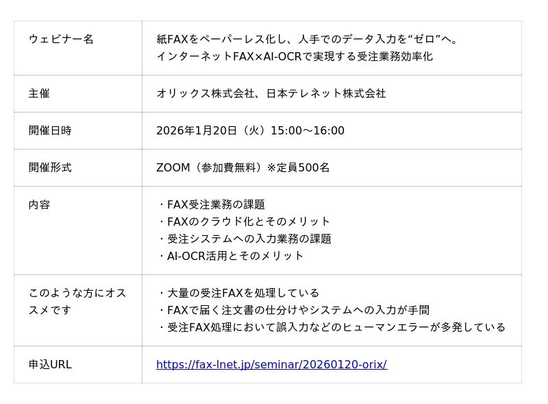 オリックス株式会社(本社:東京都港区、社長:高橋 英丈、以下 オリックス)と日本テレネット株式会社(本社:京都市、代表取締役: 瀧 麻由香、以下 日本テレネット)は、紙で届く注文書・発注書の印刷や仕分け、システムへの手入力といった非効率な受注業務を効率化する方法をテーマに、「紙FAXをペーパーレス化し、人手でのデータ入力を“ゼロ”へ。インターネットFAX×AI-OCRで実現する受注業務効率化」と題した共催ウェビナーを【1月20日(火)15:00】に開催いたします。