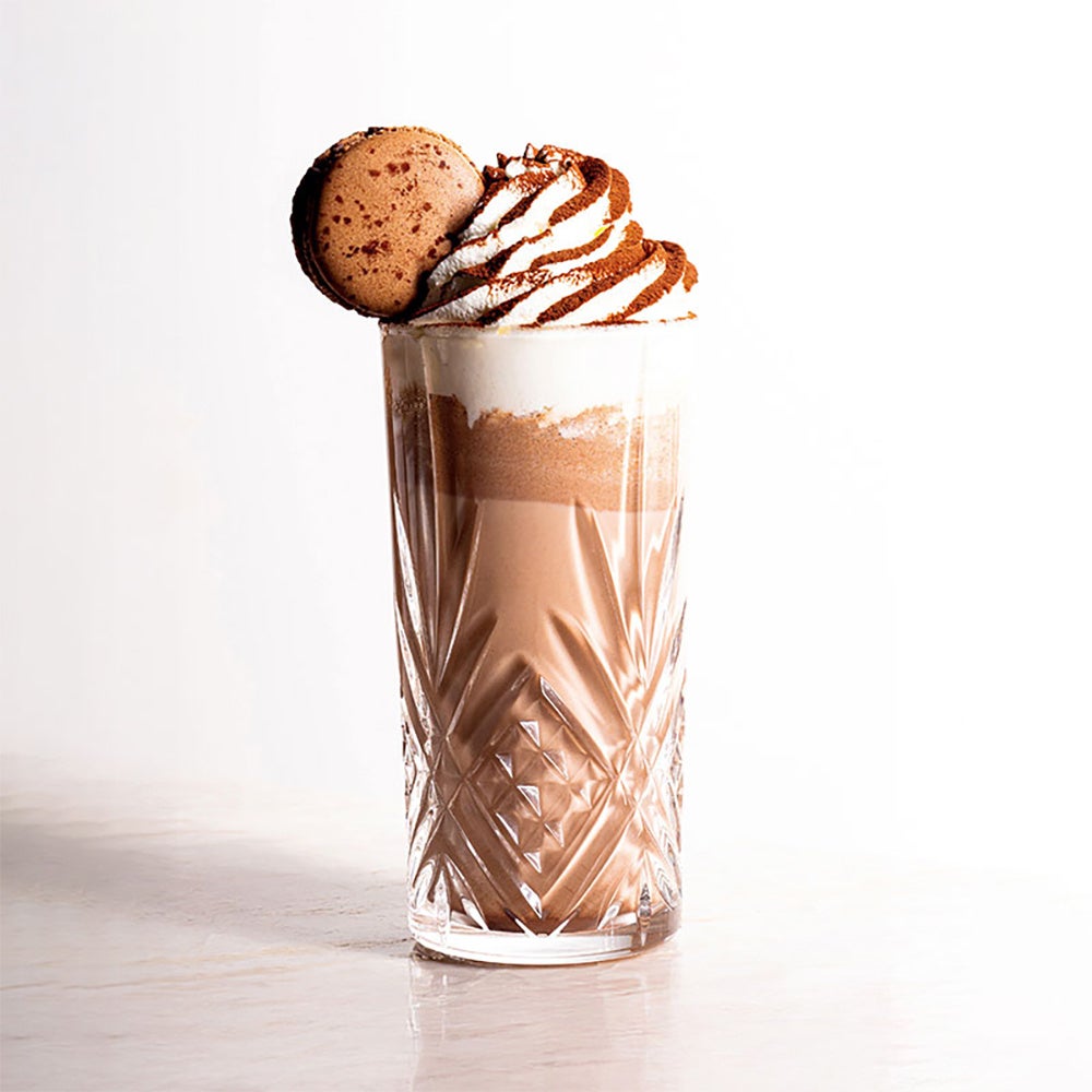 ほろ苦いカカオ67%のビターチョコレートに軽やかなシャンティクリーム、心地よい歯ごたえのマカロンコックが甘美なひとときを演出する冷たいチョコレートドリンク。