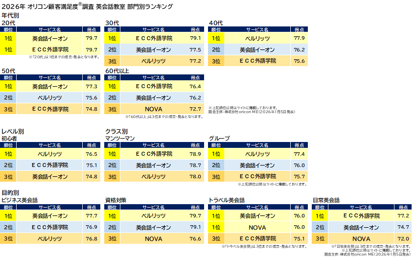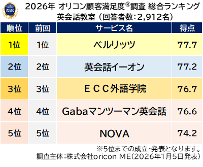 オリコン株式会社(本社:東京都港区 代表取締役社長:小池 恒、略称:オリコン)は、グループ会社である株式会社oricon MEが、実際のサービス利用者を対象に第三者の立場で実施した、『英会話教室』についての顧客満足度調査の結果を、2026年1月5日(月)14時に「オリコン顧客満足度(R)」公式サイト内にて発表いたしました。