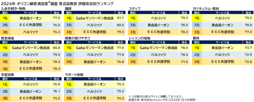 『英会話教室』項目別ランキング(2026年 オリコン顧客満足度(R)調査)