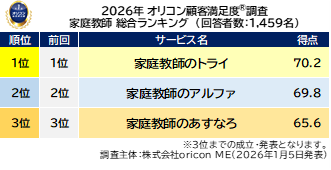 オリコン株式会社(本社:東京都港区 代表取締役社長:小池 恒、略称:オリコン)は、グループ会社である株式会社oricon MEが、実際のサービス利用者を対象に第三者の立場で実施した、『家庭教師』についての顧客満足度調査の結果を、2026年1月5日(月)14時に「オリコン顧客満足度(R)」公式サイト内にて発表いたしました。