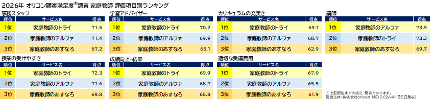 『家庭教師』評価項目別ランキング(2026年 オリコン顧客満足度(R)調査)