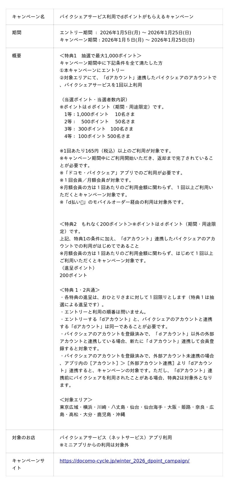 株式会社NTTドコモ(以下、ドコモ)は、バイクシェアサービスにおいて「バイクシェアサービス利用でdポイントがもらえるキャンペーン(以下、本キャンペーン)」を2026年1月5日(月)から2026年1月25日(日)まで開催いたします。