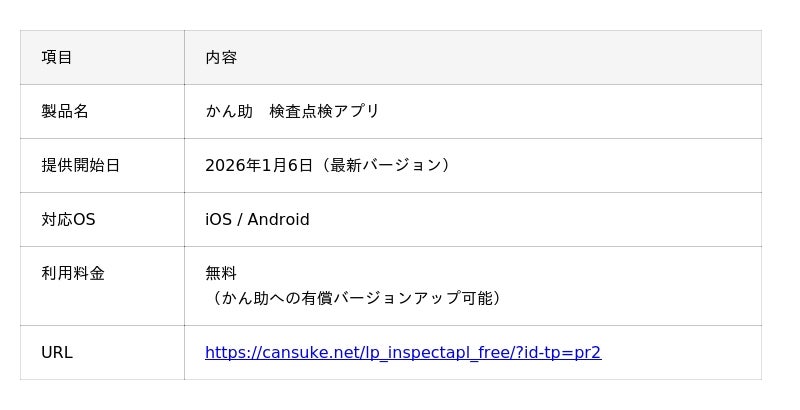 株式会社穴吹カレッジサービス(本社:香川県高松市、代表取締役:大平康喜)は、現場の検査点検業務をサポートするモバイルアプリ【かん助 検査点検アプリ】において、お客様からの要望に基づいた新機能の追加と機能改善を盛り込んだ新バージョンを、本日2026年1月6日より提供開始します。