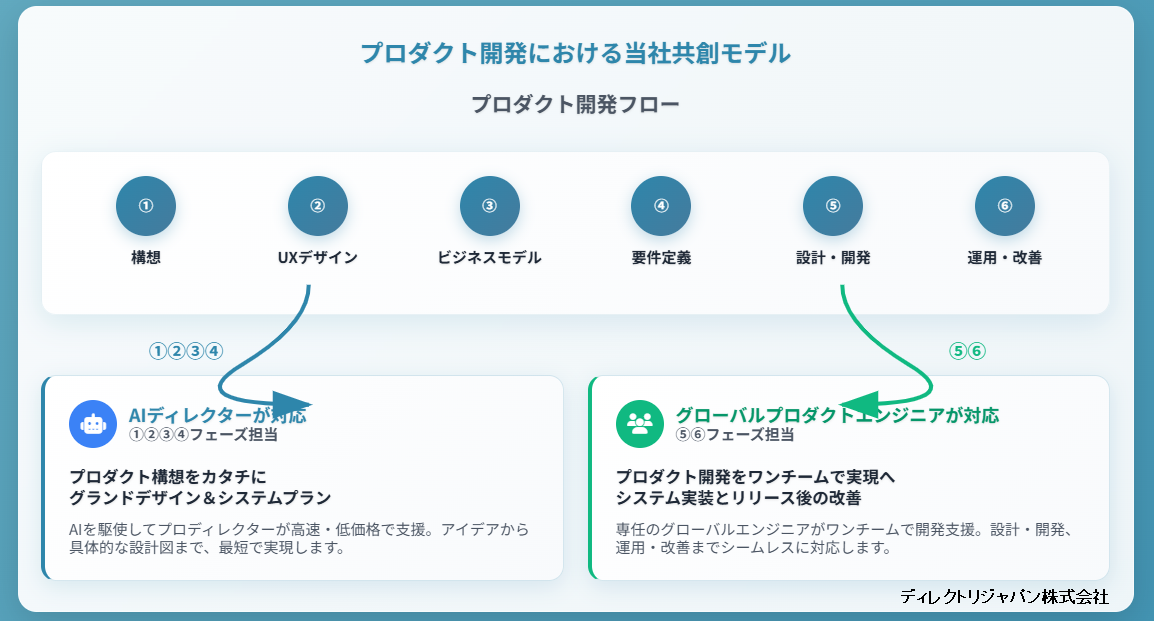 熟練ディレクターが最先端AIを駆使する独自のハイブリッド体制により、UXデザインから要件定義までを「1ヶ月・30万円(税抜)」で提供。さらに、その計画を基に「オフショアエンジニアによるローコスト開発 × AIディレクターによるプロダクト設計」を組み合わせた開発までを継ぎ目なく支援し、事業の成功確率を劇的に高めます。