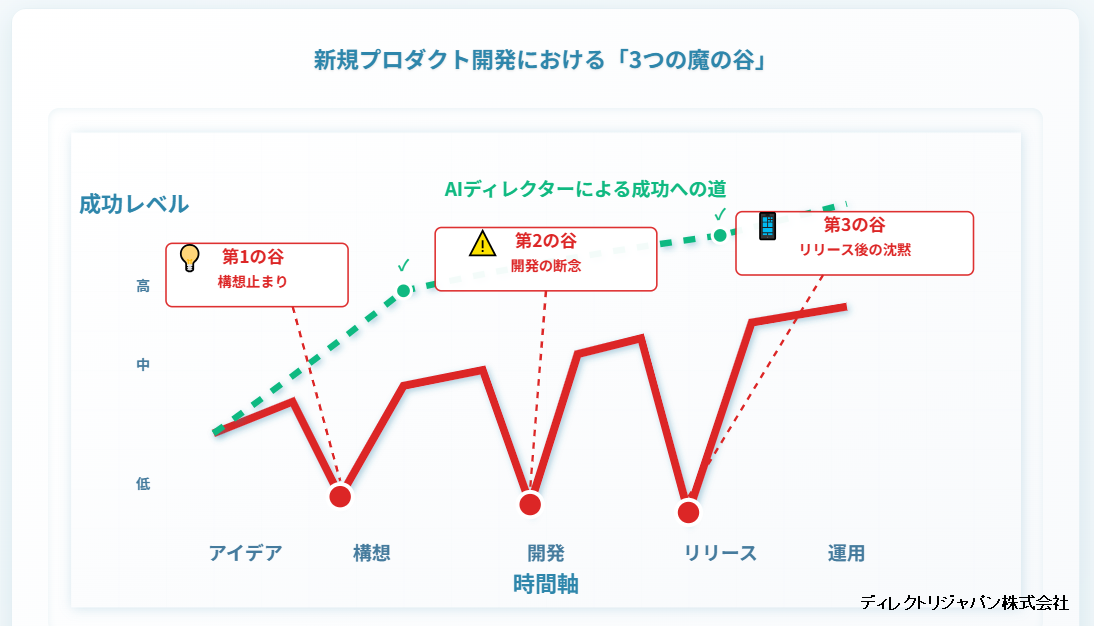 - 第1の谷:【構想止まり】 アイデアはあるが、具体的な仕様や画面イメージに落とし込めない。- 第2の谷:【開発の断念】開発ベンダーとの認識ズレや想定外の追加費用で予算が尽きる。- 第3の谷:【リリース後の沈黙】 サービスやデザインが市場ニーズとズレ、誰にも使われない。
