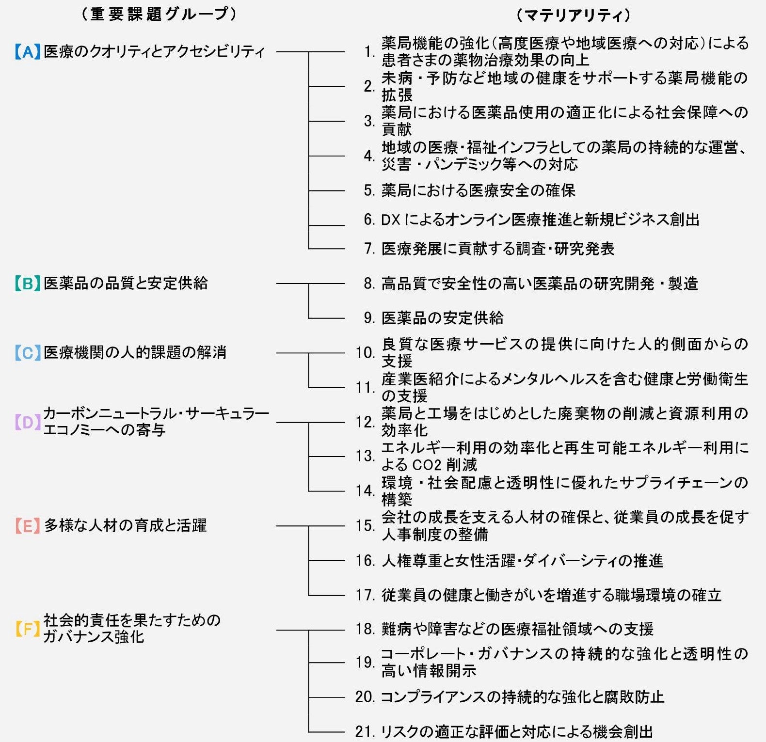 日本調剤グループは公正で透明性の高い経営基盤の構築を目指し、また、事業活動を通じた医療・ヘルスケア分野における社会課題の解決に取り組むために、マテリアリティを特定しています。日本調剤グループのサステナビリティの取り組みはこちらをご覧ください。
