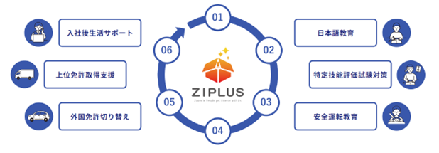 ジップラスは、免許取得支援、外国免許切替支援、人材紹介、海外人材育成事業を一体で展開し、 「運転免許取得支援 × 人材採用支援」による企業課題の総合的な解決を推進しています。