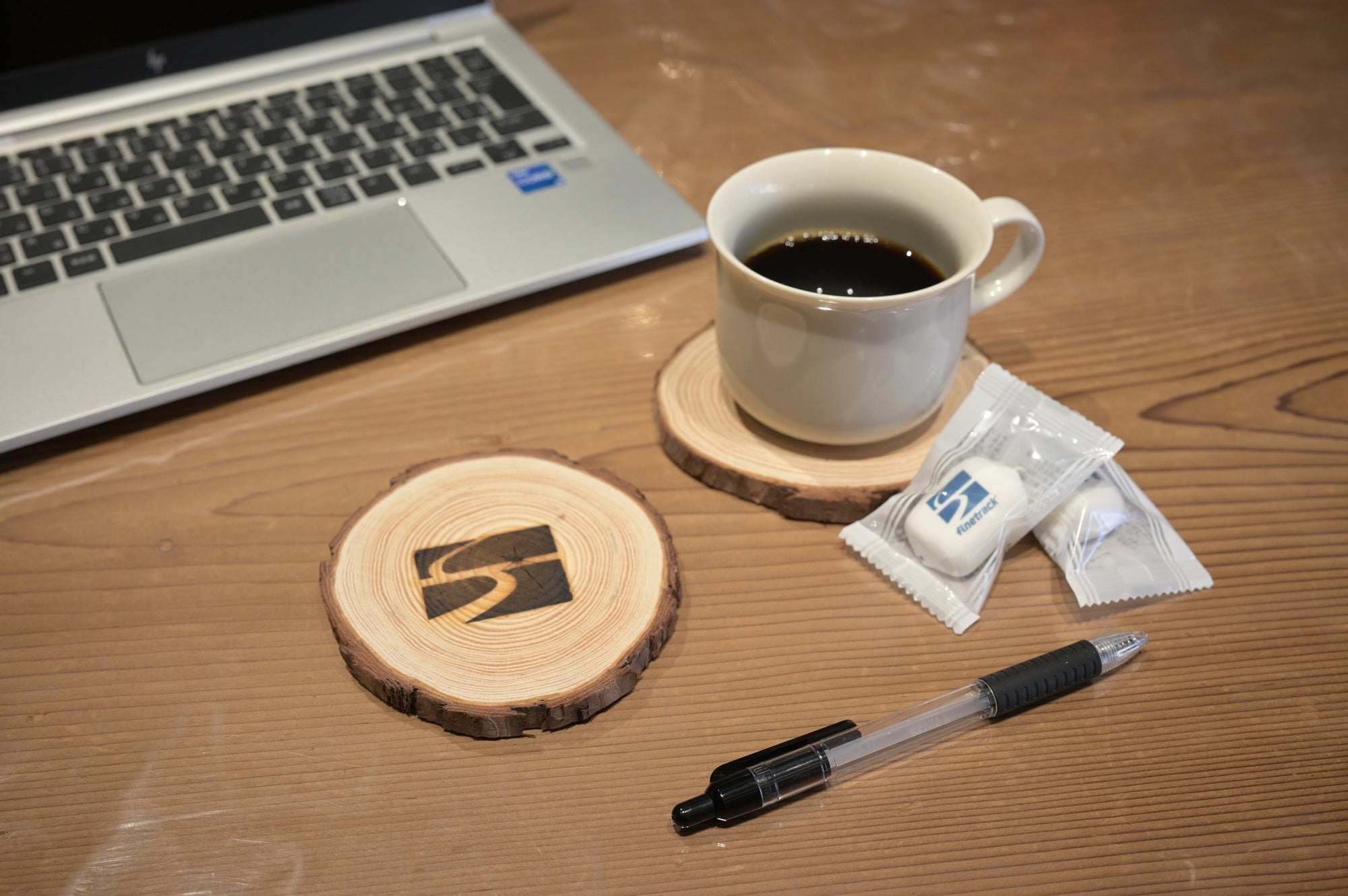 木の素材感を生かしたシンプルなデザインのコースターは、新年限定のノベルティです。