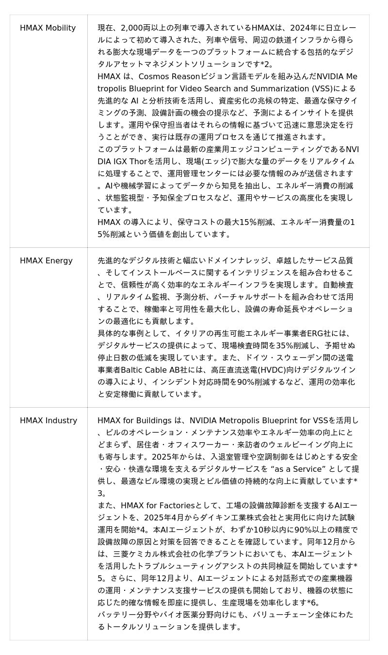 ・HMAX Energy:ミッションクリティカルなエネルギーインフラのバリューチェーン全体において、安全性・信頼性・持続可能性の確保を支援します。デジタル技術を活用したサービス群により、問題の発生を未然に予測し防止することで、稼働時間の最大化、資産寿命の延長、性能・効率の最適化を実現します。
