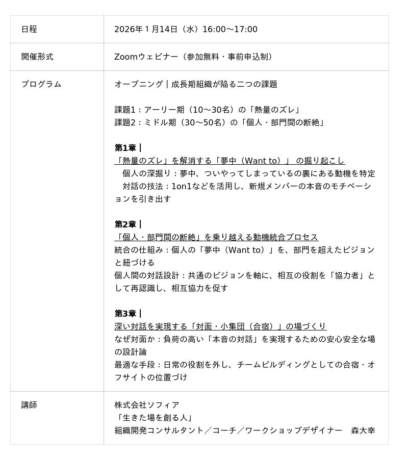 【1月14日(水)開催】「夢中」はいつから「惰性」になったか?ベンチャー拡大期の動機設計 ~熱量のズレと個人間の壁を解消する「対話手法」~