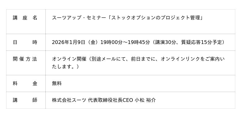 当社では、2026年1月9日(金)19時から、当社代表の小松が講師を務めるスーツアップ・セミナー「ストックオプションのプロジェクト管理」を無料開催します。