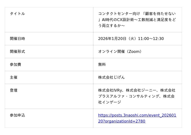 コミュニケーションプラットフォーム『Re:lation(リレーション)』を提供し、6,000社以上(※1)の導入実績を誇る株式会社インゲージ(本社:大阪府大阪市、代表取締役社長:和田 哲也)は、2026年1月20日(火)に株式会社じげん主催、株式会社IVRy、株式会社ジーニー、株式会社プラスアルファ・コンサルティング共催の無料ウェビナー「AI時代のCX設計術 ~工数削減と満足度をどう両立するか~」に登壇することをお知らせいたします。