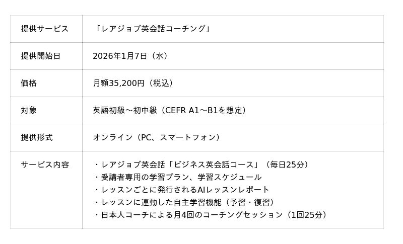 EdTechカンパニーの株式会社レアジョブ(以下、レアジョブ)は、多くの英語学習者が陥る学習の停滞を繰り返す“学習ゾンビ状態”を解消し、確かな手ごたえと自走力をつくる新サービス「レアジョブ英会話コーチング」を提供開始しました。