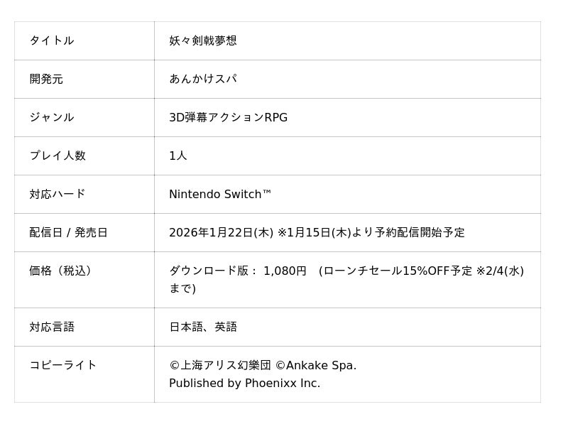 株式会社Phoenixx(フィーニックス)(東京都武蔵野市、代表取締役社長:坂本 和則)は、東方Projectファンゲームである3D弾幕アクションRPG『妖々剣戟夢想』をNintendo Switch(TM)向けに、1月22日(木)より配信開始を決定したことをお知らせいたします。