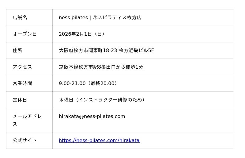 株式会社New Conditioning(所在地:東京都千代田区神田錦町2-2-1 KANDA SQUARE 11F、代表取締役:石田涼太郎)、整体とマシンピラティスを組み合わせたパーソナル専門スタジオ「ness pilates(ネスピラティス)」の4号店となる枚方店を、2026年2月1日にグランドオープンいたします。
