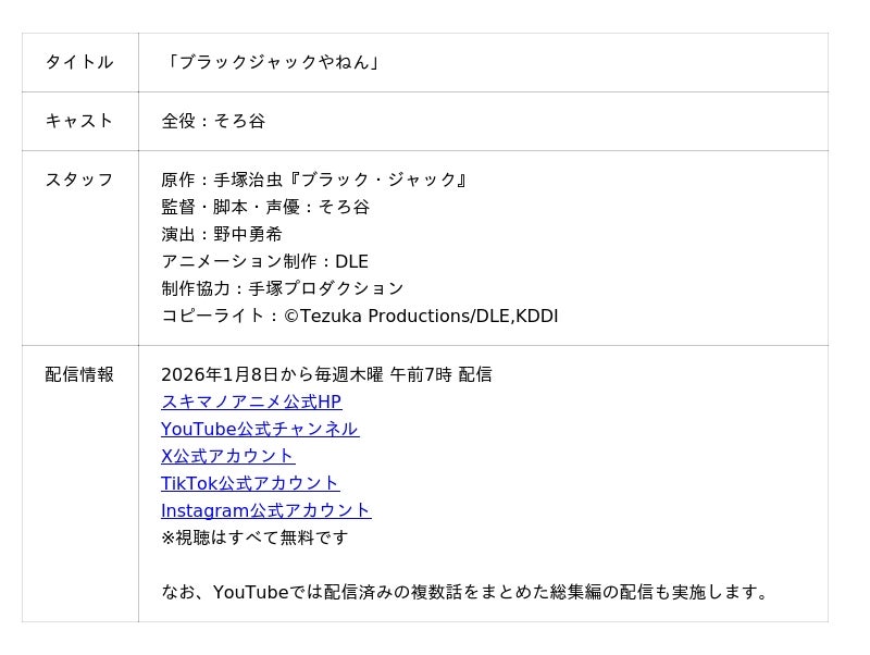 「ブラックジャックやねん」は、”漫画の神様”と称される手塚治虫による医療漫画の金字塔『ブラック・ジャック』を、総再生回数10億回を超えるYouTubeチャンネル「そろ谷のアニメっち」を手掛けるクリエイター・そろ谷が独自の視点でコントアニメ化した作品です。配信はスキマノアニメ公式YouTube、X、TikTok、Instagramにて、2026年1月8日以降、毎週木曜の午前7時に公開となります。