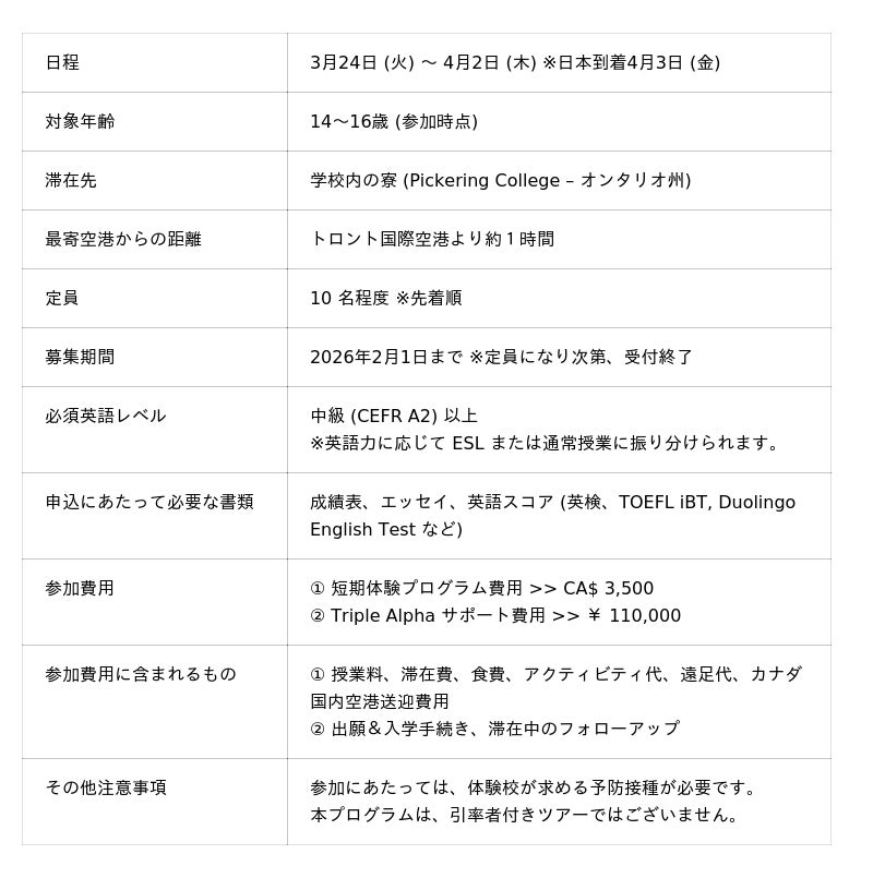 アメリカに拠点を置く教育コンサルティング会社 Triple Alpha は、2026年度春休みに、カナダ・オンタリオ州のボーディングスクール Pickering College を舞台とした、短期留学プログラムを実施いたします。