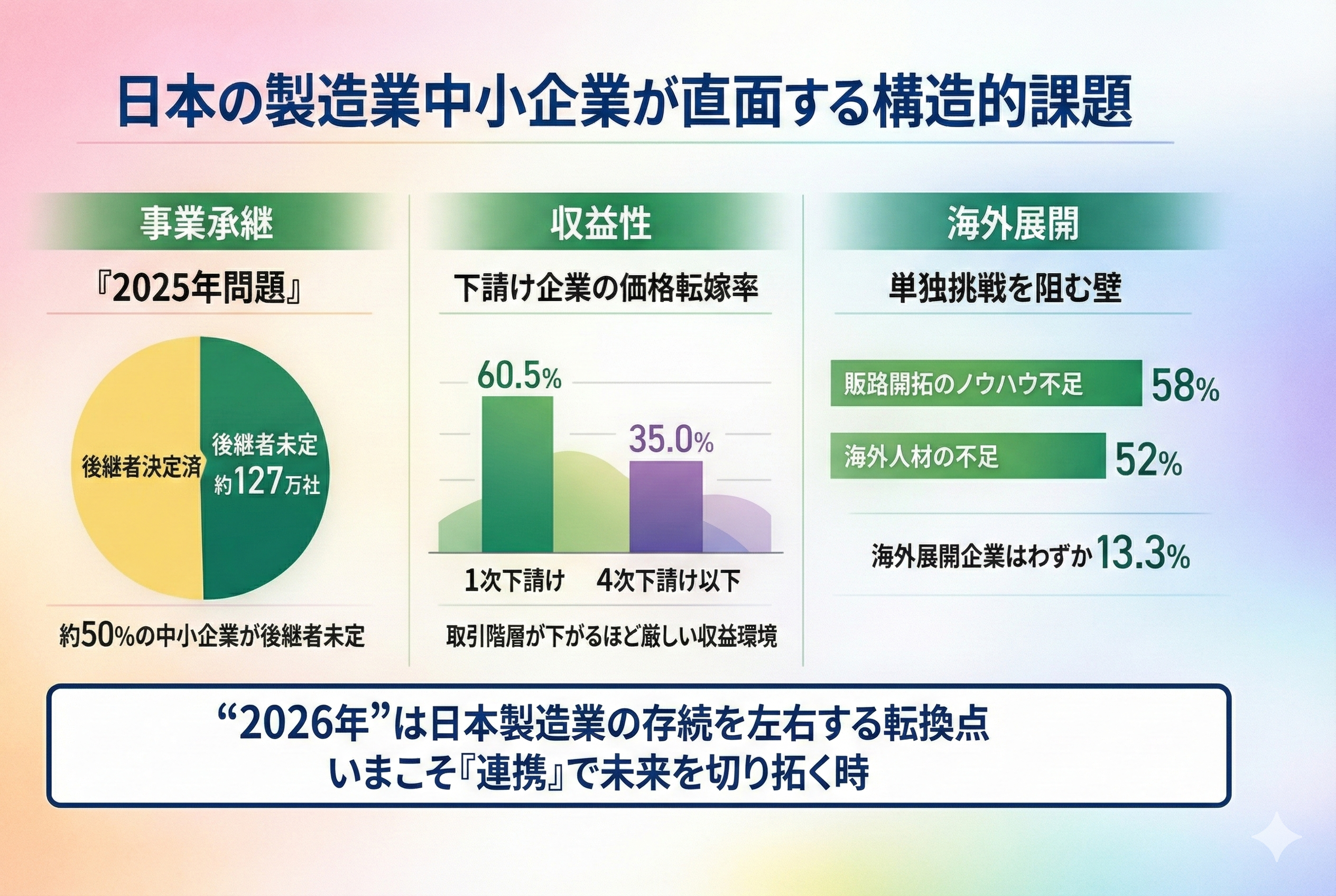 出典元: 中小企業庁「中小企業・小規模事業者の経営承継に関する検討会報告書」(2017年)中小企業庁「価格交渉促進月間フォローアップ調査」(2024年9月公表)日本政策金融公庫総合研究所「中小企業の海外展開に関する調査」(2023年度)中小企業庁「2020年版 中小企業白書」